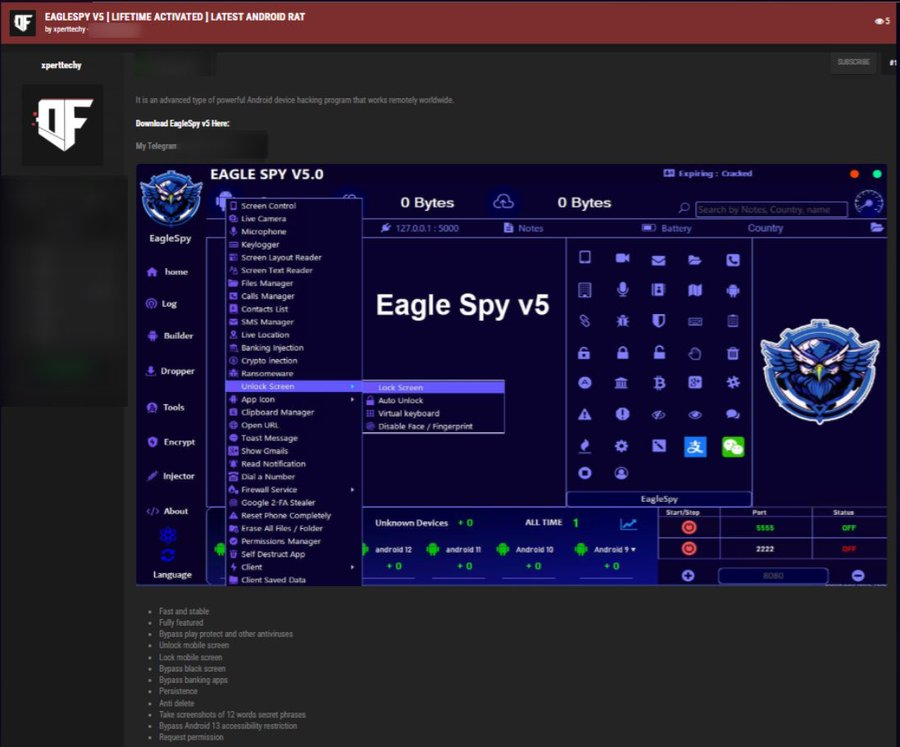 Como otros RAT comerciales, EagleSpy se distribuye en varias ramas (por ejemplo EagleSpy 3.0, v4 y v5) que añaden progresivamente más inyecciones para bancos y criptomonedas, mejoran las técnicas de evasión y amplían la compatibilidad con versiones recientes de Android, manteniendo la misma lógica de negocio basada en licencias de por vida, actualizaciones “gratuitas” y, en ocasiones, soporte vía grupos privados de Telegram o foros especializados. Es importante destacar que los precios citados proceden de anuncios criminales no verificables y pueden cambiar con rapidez; además, la distribución y adquisición de este tipo de herramientas es ilegal en la mayoría de jurisdicciones, por lo que solo deben analizarse con fines de investigación y defensa en entornos controlados.